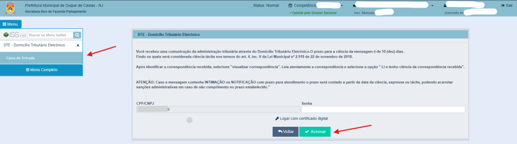 2. No menu à esquerda, vá em DTE – Domicilio Tributario Eletronico.